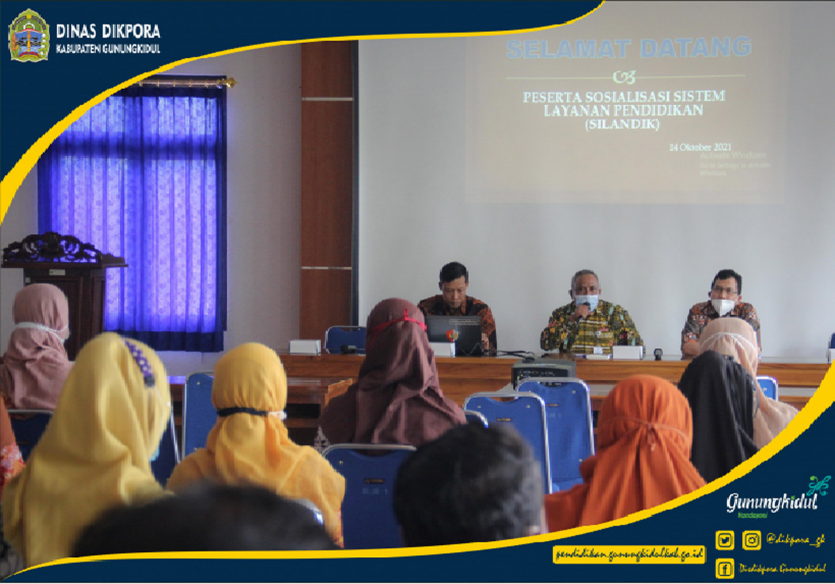 WONOSARI- Dinas Pendidikan, Pemuda, dan Olahraga (Disdikpora) Kabupaten Gunungkidul bersama Badan Perencanaan Pembangunan Daerah (Bappeda) Kabupaten Gunungkidul menyelenggarakan kegiatan Sosialisasi Sistem Informasi Layanan Pendidikan (Silandik) tahun 2021. Bertempat di Ruang Rapat Handayani Disdikpora kegiatan dihadiri langsung oleh Sumiyat, S.Pd., M.M.Pd. selaku pemateri dari Bappeda dan Tijan, S.Sos., M.M. Selaku Kepala Bidang Sekolah Menegah Pertama Disdikpora Kabupaten Gunungkidul.